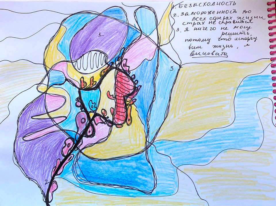 2 года я крутила на листе разные варианты, много рисовала в интуитивном направлении терапии и в один день я буквально увидела простой графический способ, который сработал ярко с моим запросом.