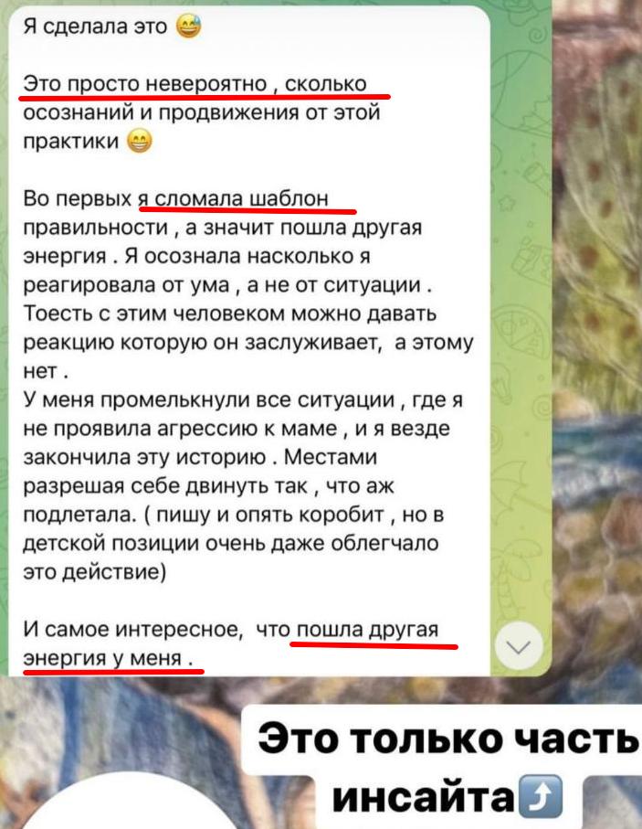“Вы сломали все шаблоны, которые я имела о психике, психологии и, вообще, о жизни. Это как разворот на 180 градусов. Идём туда, куда не шли. И это что-то невероятное, мощное, светлое и даёт будущее”.